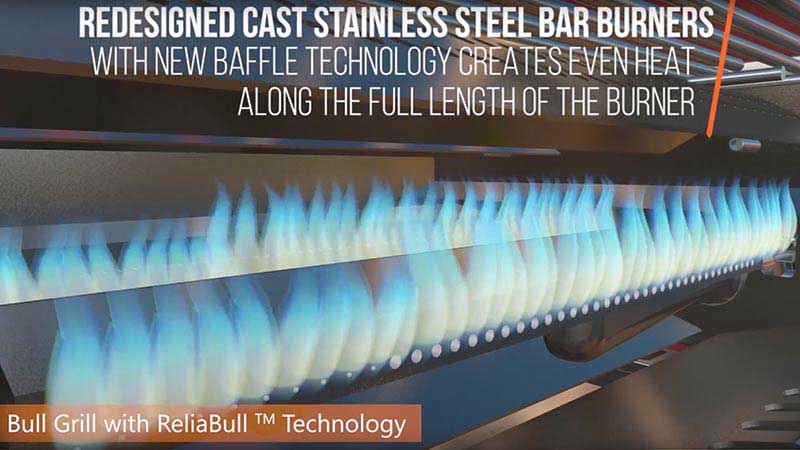 The ReliaBull Heat Technology was created by leading engineering experts! at Cal Poly and improves heat distribution on your Bull grill by 250%. The redefined cooking system (ReliaBull Technology) features smaller holes in the rear of the cast stainless grill! burners and then larger holes toward the front of the burners where the gas comes in under the highest pressure. The different sized holes help equalize the gas pressure and flames more evenly along the length of the burners. The steel flame tamers (or heat shields) also have smaller holes at the back of the plates and larger holes upfront. The new ReliaBull technology improves heat distribution on your grill by 50 percent, creates a more even grilling surface, and eliminates hot and cold spots so that you can use your entire grilling surface. Not only does ReliaBull improve cooking performance, but it also regulates gas pressure more evenly, thus saving you fuel and money! Comparing the old Bull BBQ cooking system to the new ReliaBull Heat Technology, Bull BBQ saw a 7% increase in overall fuel consumption.